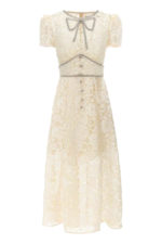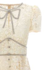 Cream cord lace bow midi dress in corded lace with bow and applique jewel buttons round neck short sleeves back zipper and matching belt