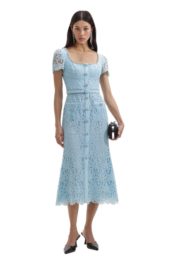 A vision of romance, this fit-and-flare midi dress is cut from elegant blue lace. Accessories come included, thanks to its diamanté & pearl embellished neckline – all ready for the next soirée.