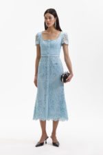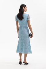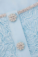A vision of romance, this fit-and-flare midi dress is cut from elegant blue lace. Accessories come included, thanks to its diamanté & pearl embellished neckline – all ready for the next soirée.